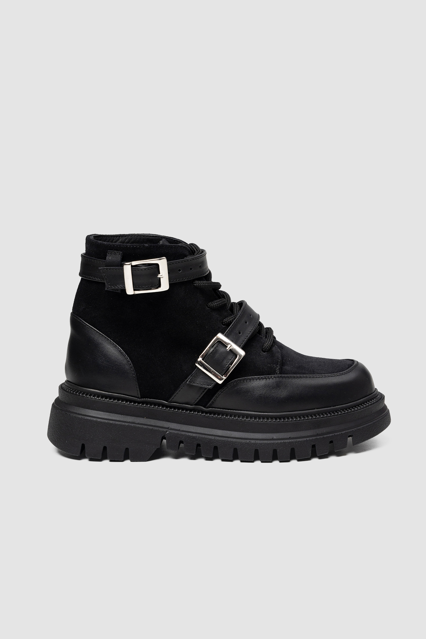 Realizate din piele naturală, în combinație de piele netedă și piele întoarsă, ghetele DUOMO se evidențiază prin talpa chunky cu profil robust, ce oferă stabilitate și un look contemporan, dar și prin cataramele metalice reglabile, ce adaugă un accent industrial subtil. Șireturile frontale completează designul, asigurând o potrivire confortabilă și sigură pe tot parcursul zilei.