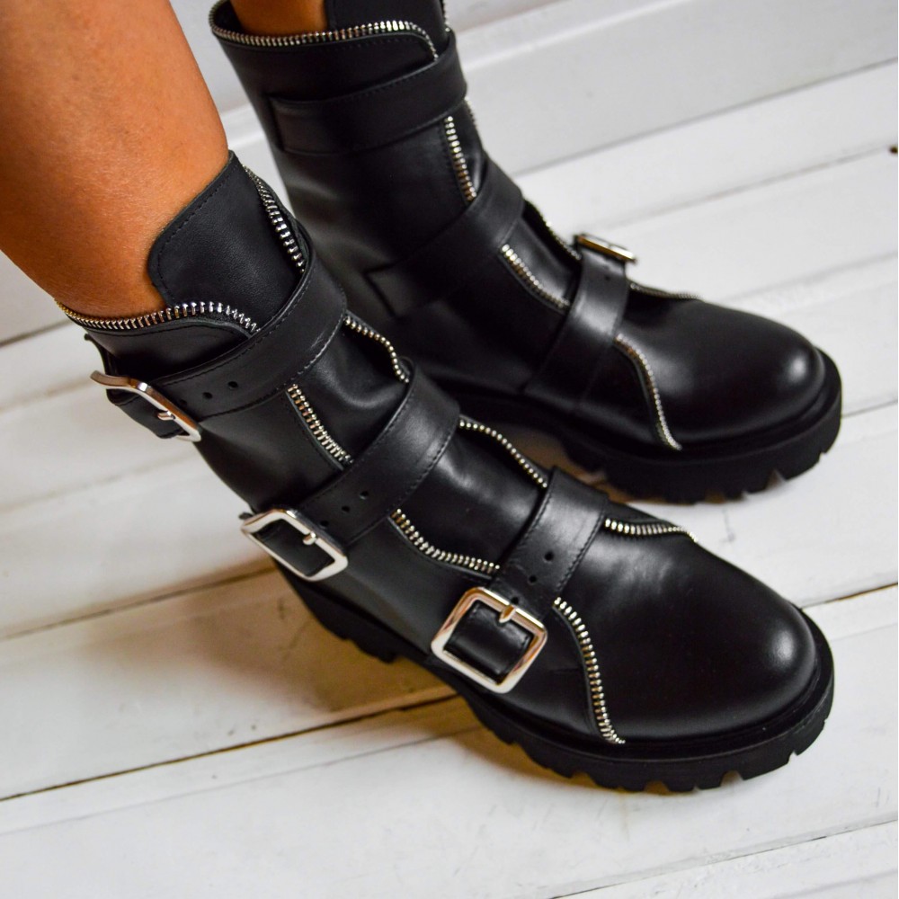 Bocancii sunt accesorizati cu trei catarame mari si fermoar(decor) cusut manual.