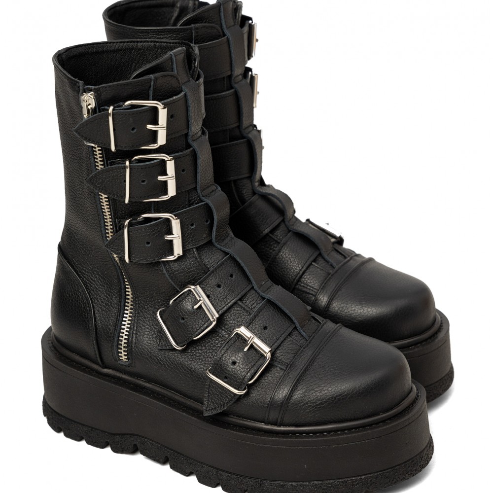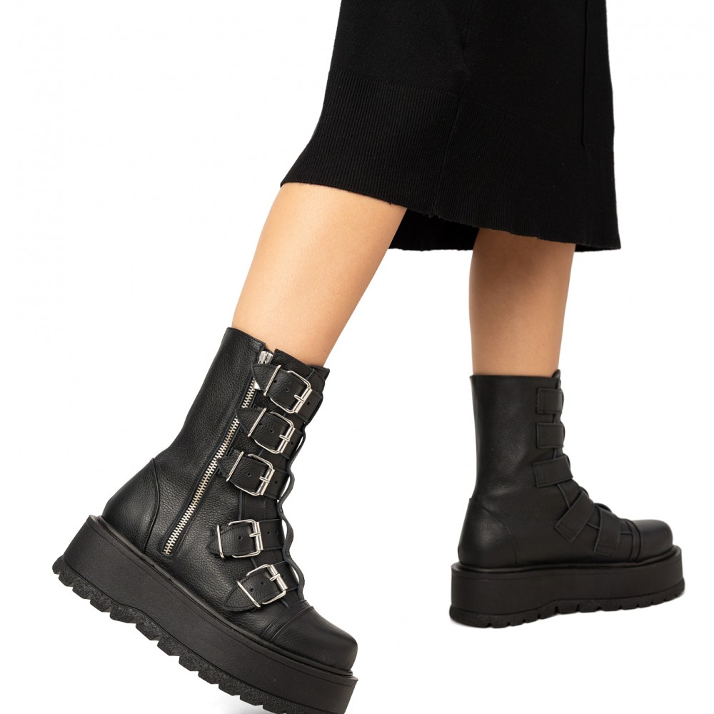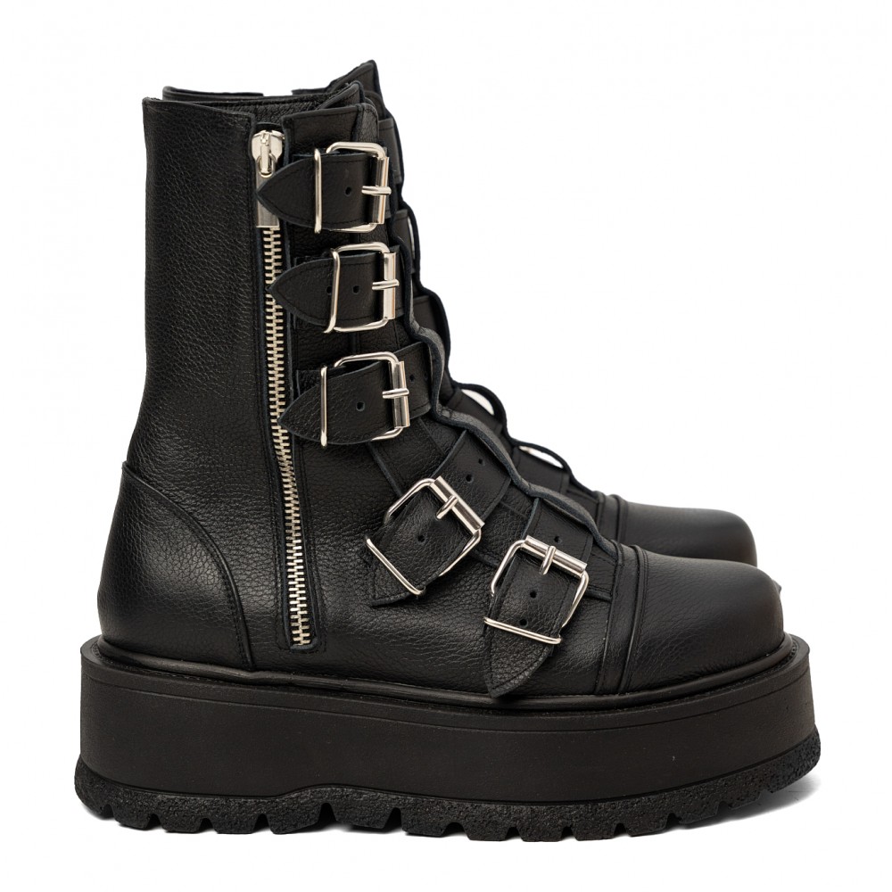 Realizate din piele naturală texturată, aceste ghete se remarcă prin talpa groasă, stabilă și ultra-contemporană, dar și prin detaliile metalice îndrăznețe – de la cele 6 catarame reglabile până la fermoarul lateral funcțional.