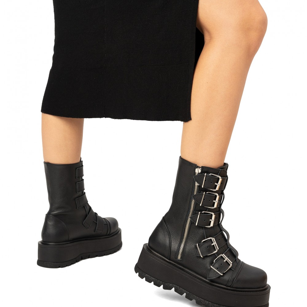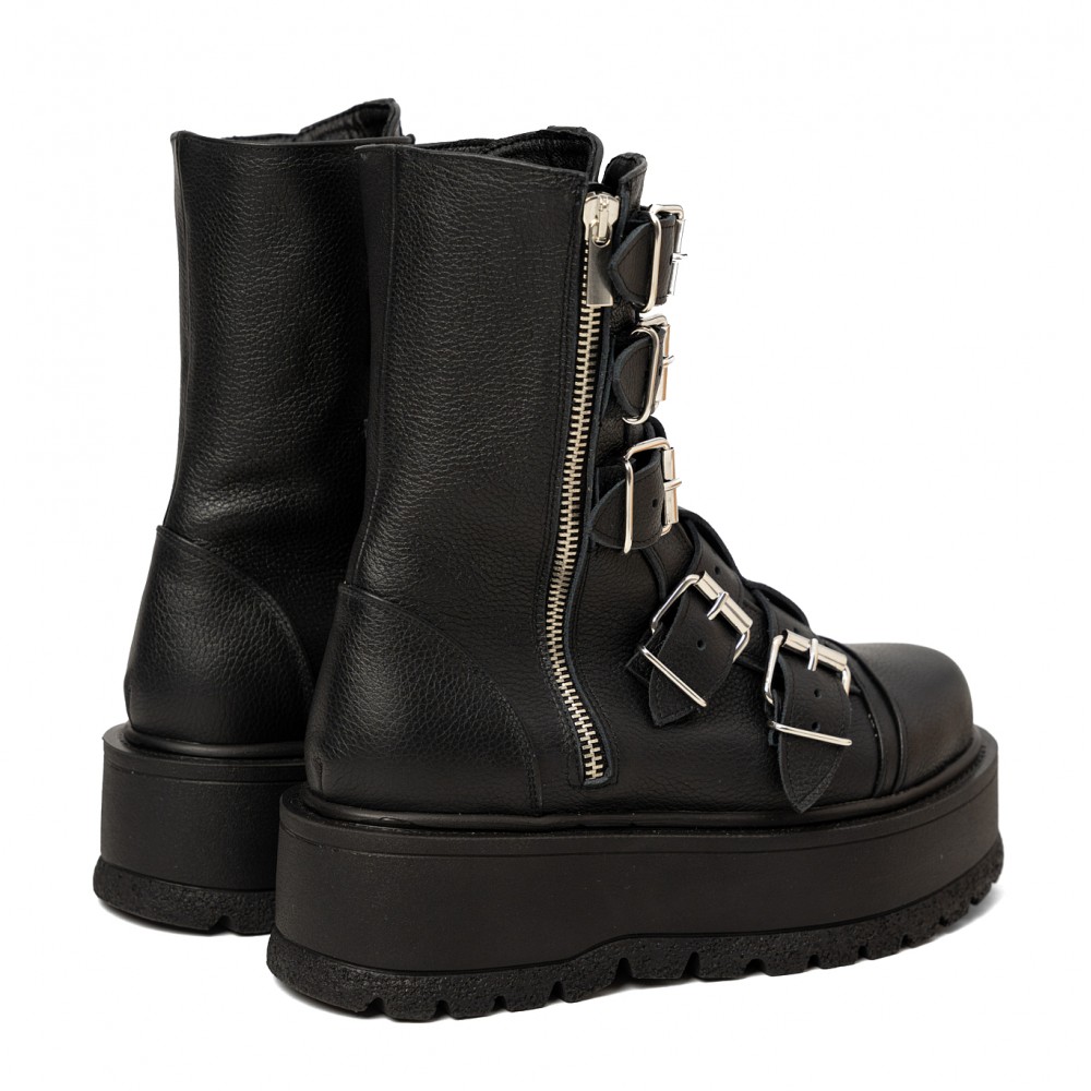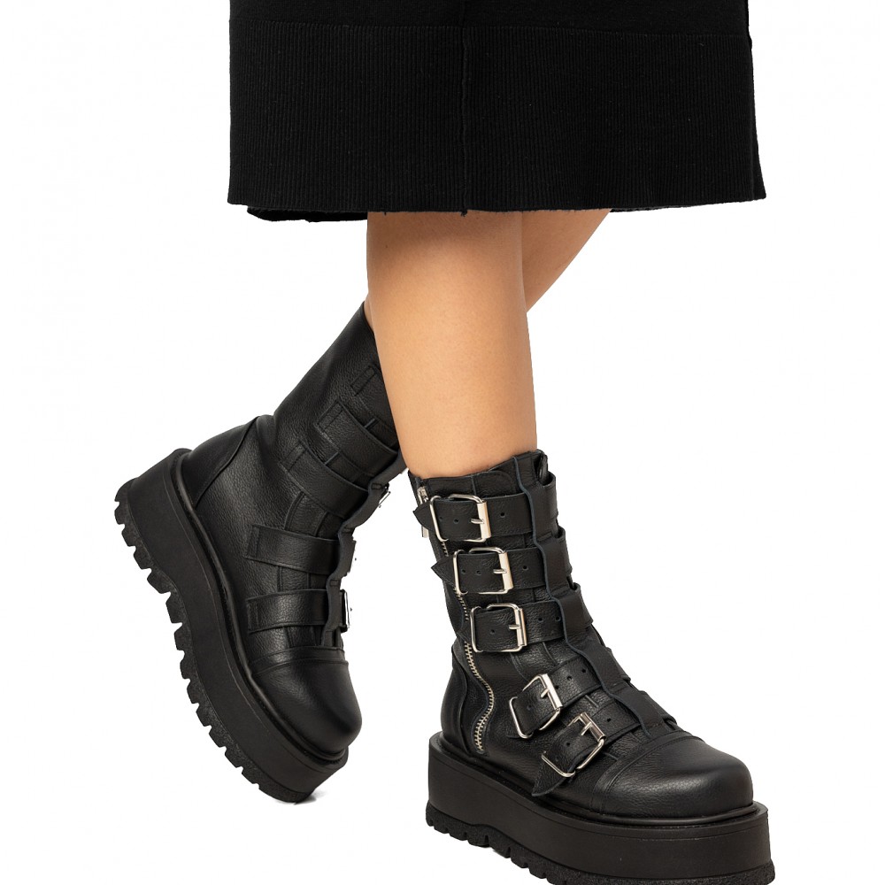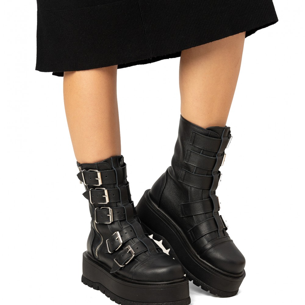 Realizate din piele naturală texturată, aceste ghete se remarcă prin talpa groasă, stabilă și ultra-contemporană, dar și prin detaliile metalice îndrăznețe – de la cele 6 catarame reglabile până la fermoarul lateral funcțional.