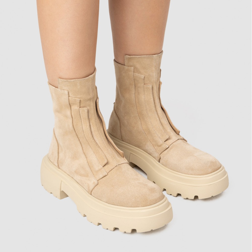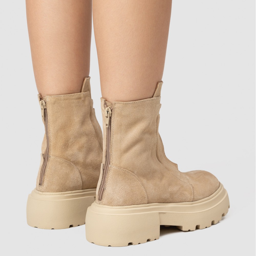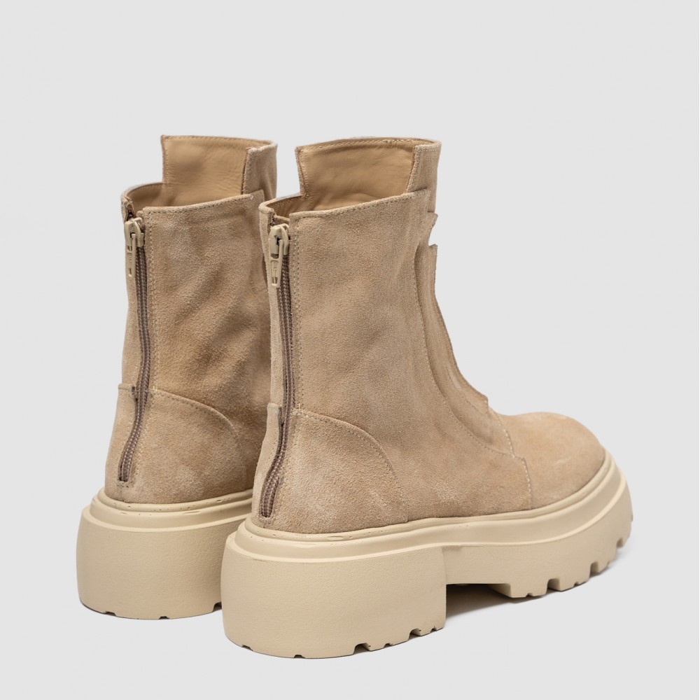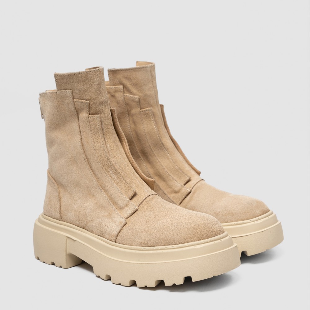 Realizate din piele naturală întoarsă în nuanță bej, cu textură fină și elegantă, ghetele sunt completate de fermoarul amplasat la spate, care asigură o încălțare rapidă și păstrează liniile frontale minimaliste. Talpa chunky, într-o nuanță deschisă, oferă stabilitate, confort și un aer modern, inspirat din stilul urban.