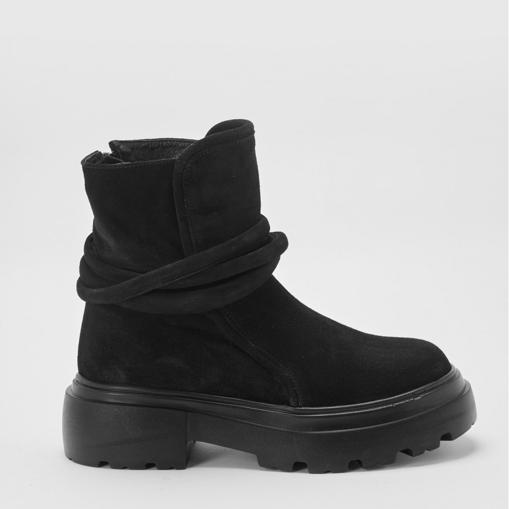 Realizate manual din piele naturală intoarsa, aceste ghete se remarcă prin silueta compactă, liniile curate și detaliul decorativ răsucit în jurul gleznei, ce adaugă profunzime vizuală și un accent distinct, cu personalitate.