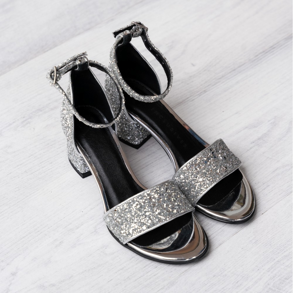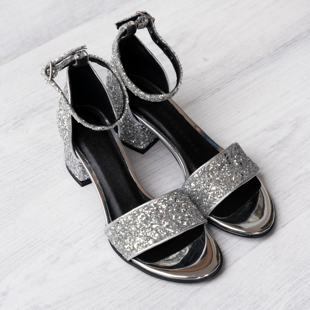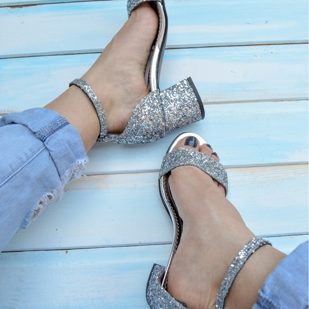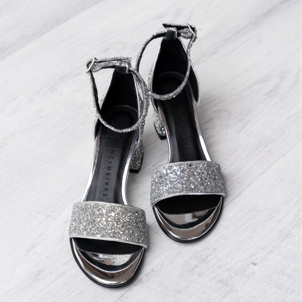 Sandale cu toc gros, comode, realizate din glitter si piele in interior.